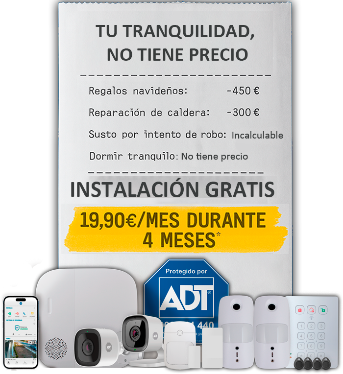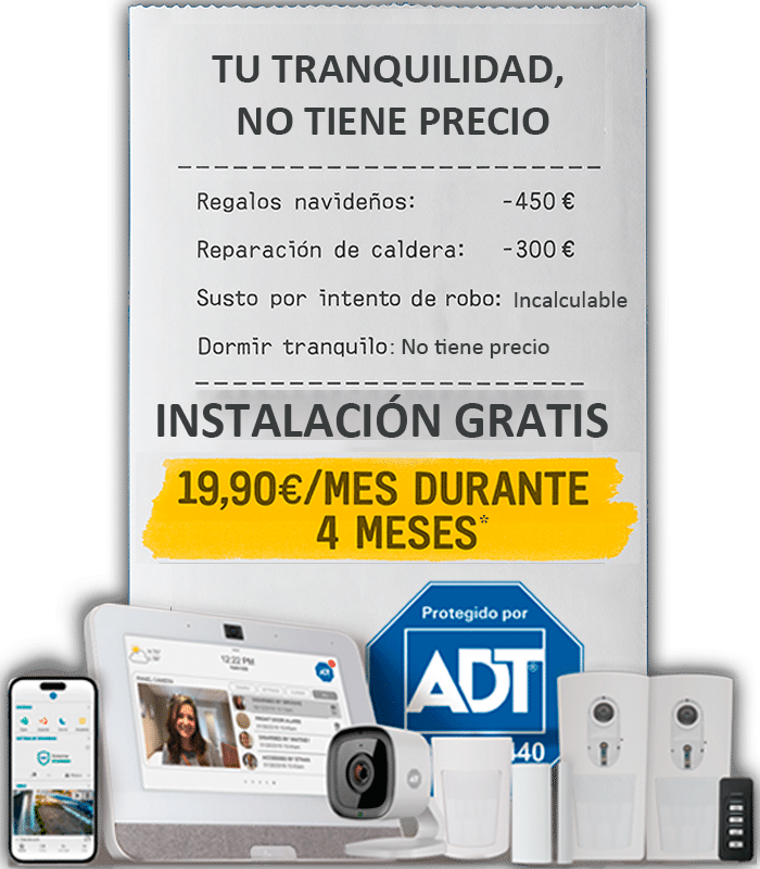 *19,90€ con iva incluido durante los 4 primeros meses sobre el precio tarifa del paquete elegido. Después desde 42,35€/mes IVA incluido. Instalación y alta gratis en paquetes ADT para hogar. Servicio ADT help incluido de acuerdo con las condiciones contractuales del contrato..